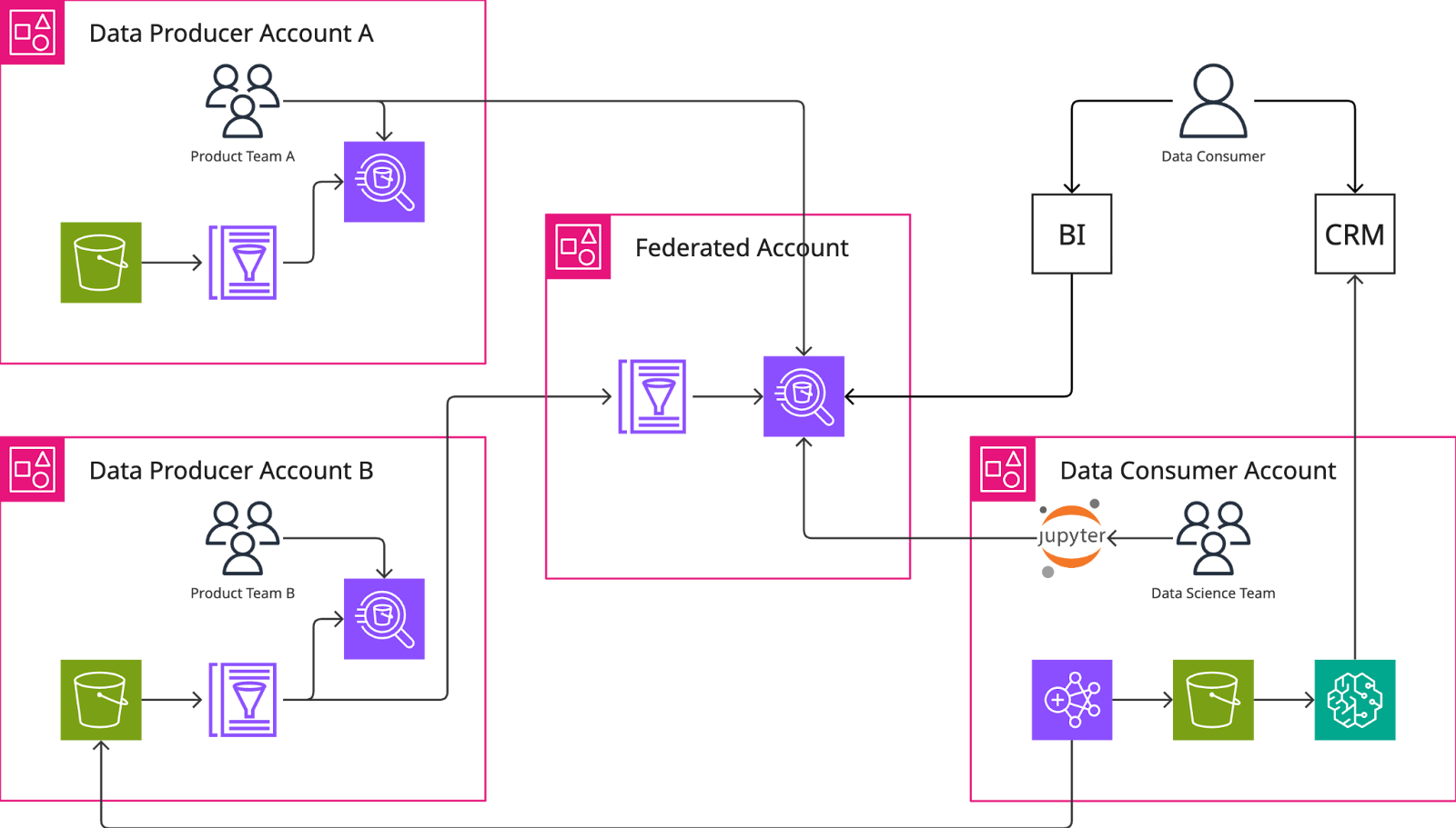 To make the most use out of all the new tables made available by us and other data producers, we needed a data catalog component to complement our lakehouse architecture. Glue’s Data Catalog supports connections to all storage locations for other teams’ product domain data as well as a way to federate access to tables across accounts. This was key for us as a centralised data team since we needed a simple way to work with the first-order data products provided by other data producers. As a part of each domain team transitioning into a data producer role, we worked together to configure their respective data catalogs so that they could be shared with others.