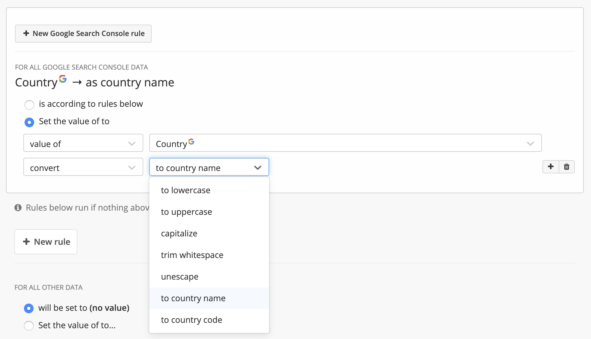 When creating or editing a dimension in Funnel, you can now automatically standardize country fields using rules.
